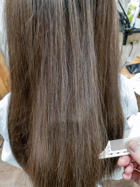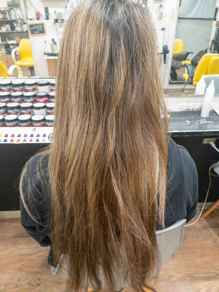 毎日コテを使うので仕方ないのですがこのままカラーをしてもすぐに色が抜けるので今回はベホマラーをして髪の毛の体力を上げて、収まりもよくしながらカラーをさせてもらいました。