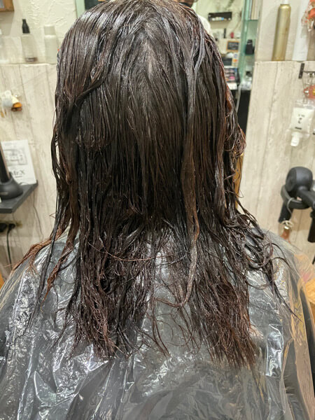今回はダメージ具合をみてジュエリーシステムトリートメントの中でも真ん中のクラスのLULUトリートメントをさせてもらい縮毛矯正をします。