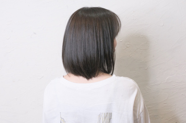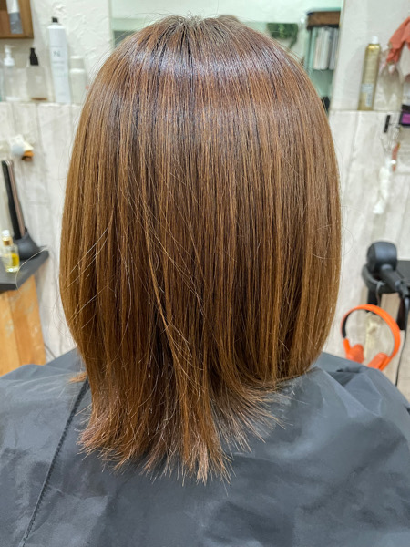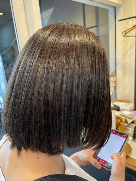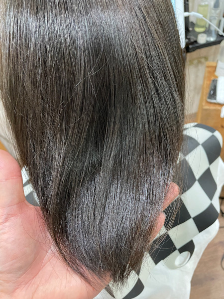 今回は元々髪質が柔らかいお客様なのでジュエリーシステムティアラジェルの方が相性良いので使用しているのですが艶がサラサラになりトリートメントをしたようになっています。
