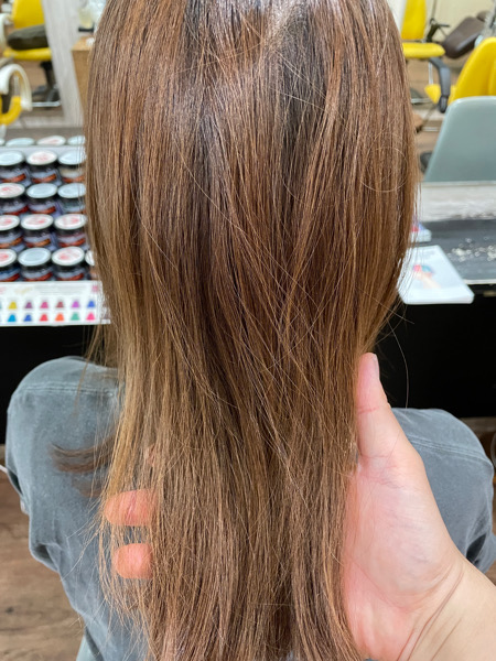 カラーも褪色していて、パサツキも気になるので今回は少し肩ラインで切り、ここに透明感のあるグレージュカラーにします。