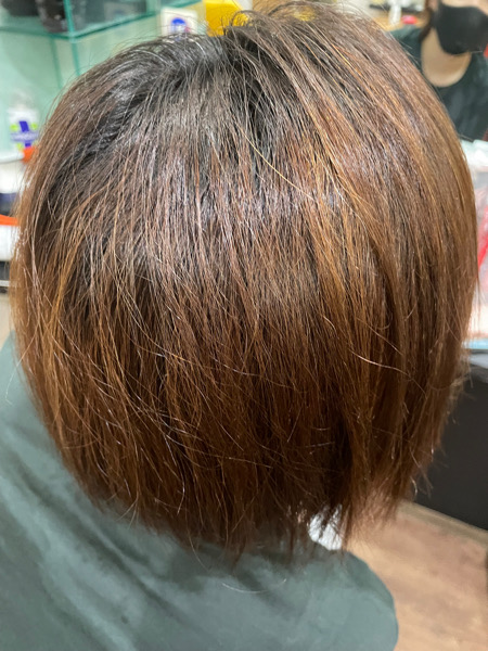 今回はカラーも褪色しているので、ここに外国人風の透明感のある白髪染め、そして白髪ボカシのハイライトをいれます。
