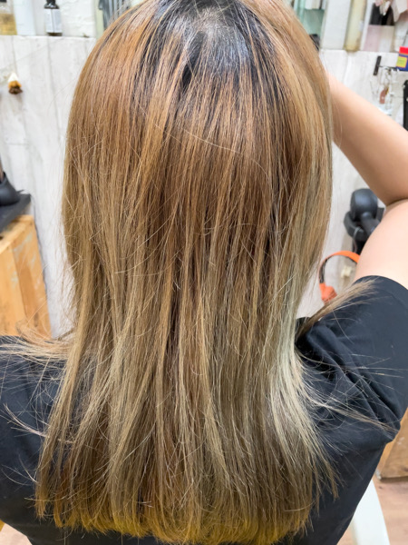 根本を再びブリーチするか悩んだのですが今回はそれをやめて毛先にいくに従って自然なグラデーションになるようにカラーをしていきます。