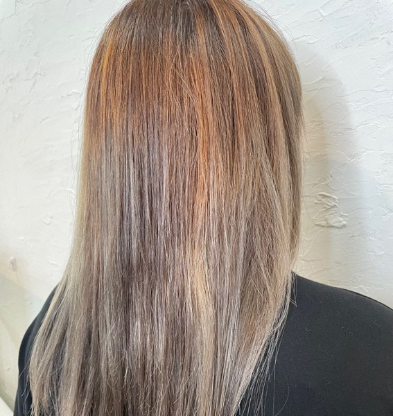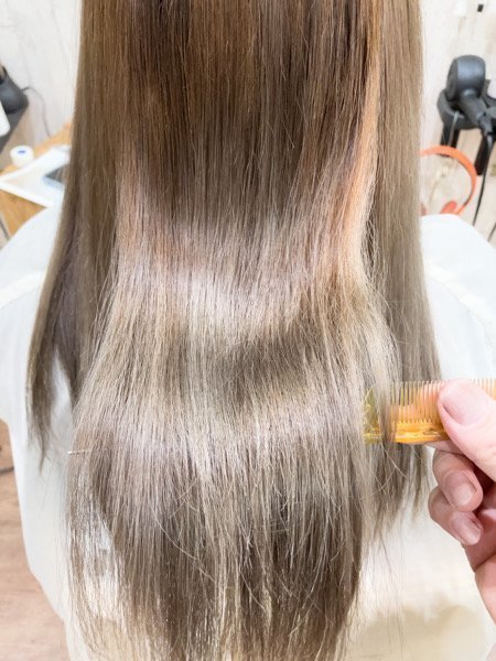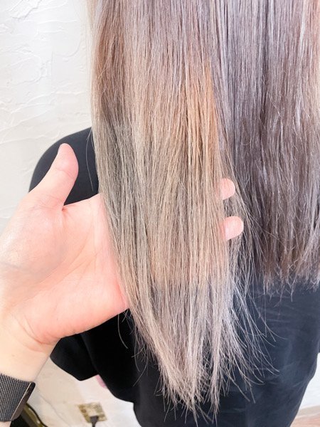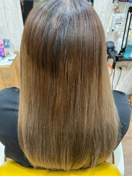 根本は元々ブリーチしてないのですが毛先が明るいので白髪が気にならないと言うことのなので今回は脱白髪染めとしてファッションカラーと艶トリートメントでケアをします。