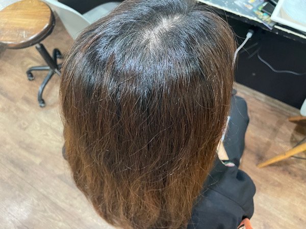 そこで今回は白髪も入るカラーを根本にして毛先はオシャレ染めで10分で終えてその後にトリートメントをします。