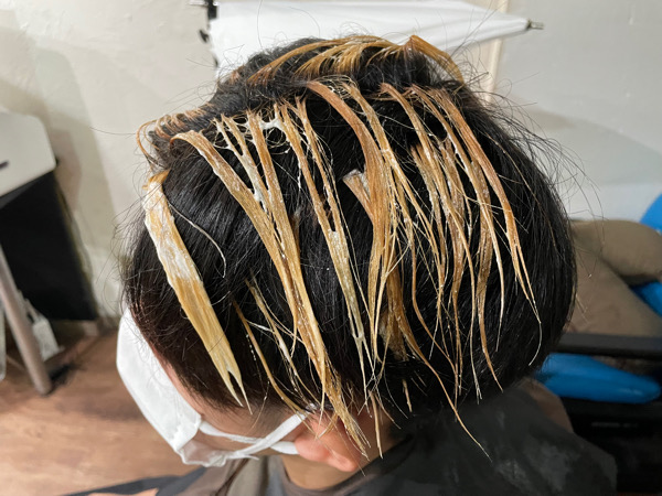 今回スタイルとしてセンター分けとマッシュのどちらでもできるようにまずブリーチしてここから色をかぶせます。