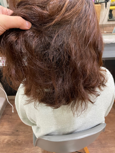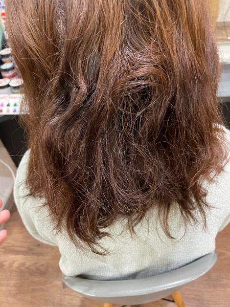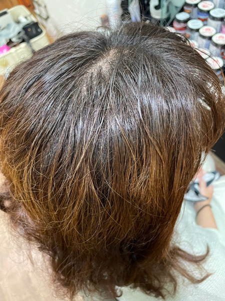 そして根本は白髪が伸びているのでこちらに縮毛矯正とピンク系のカラーを入れていきます。
