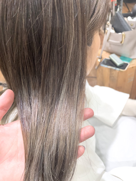より白くするなら次回再びブリーチをするのも良いですが、上から濃いグレイを入れて徐々に黄色みを取っていくという方法もあります。