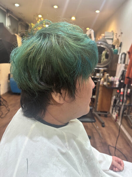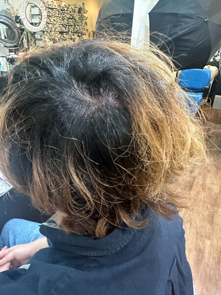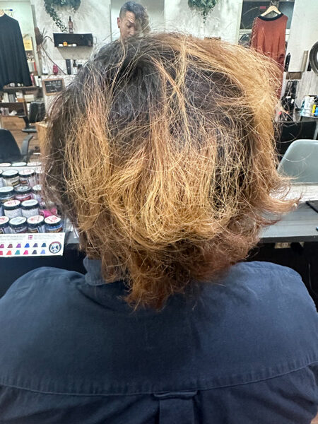 今回はカットをして根本と既染部のブリーチの色を合わして、上から希望のカラーを入れる。