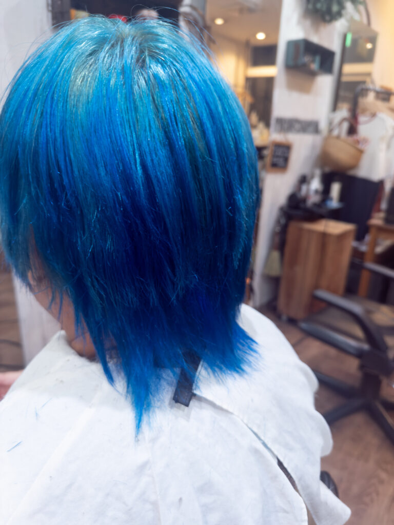 仕上がりは鮮やかなブルー。髪のツヤや手触りも守ることができました。