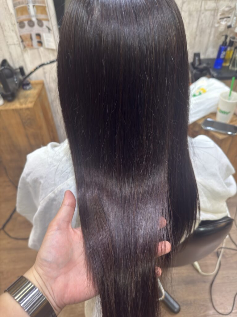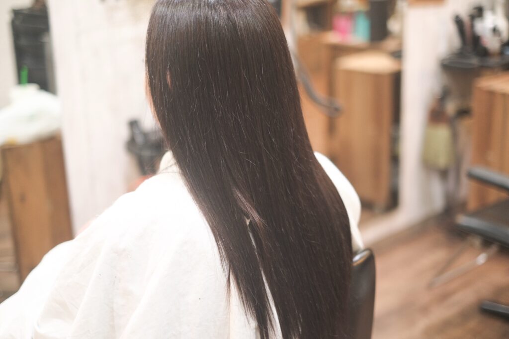 髪の状態(ダメージ・既矯正の有無・カラー履歴)をチェックし、薬剤濃度・塗布量・アイロン温度を最適化。特にロングの場合は根元〜中間のコントロールが仕上がりと時間に直結します。