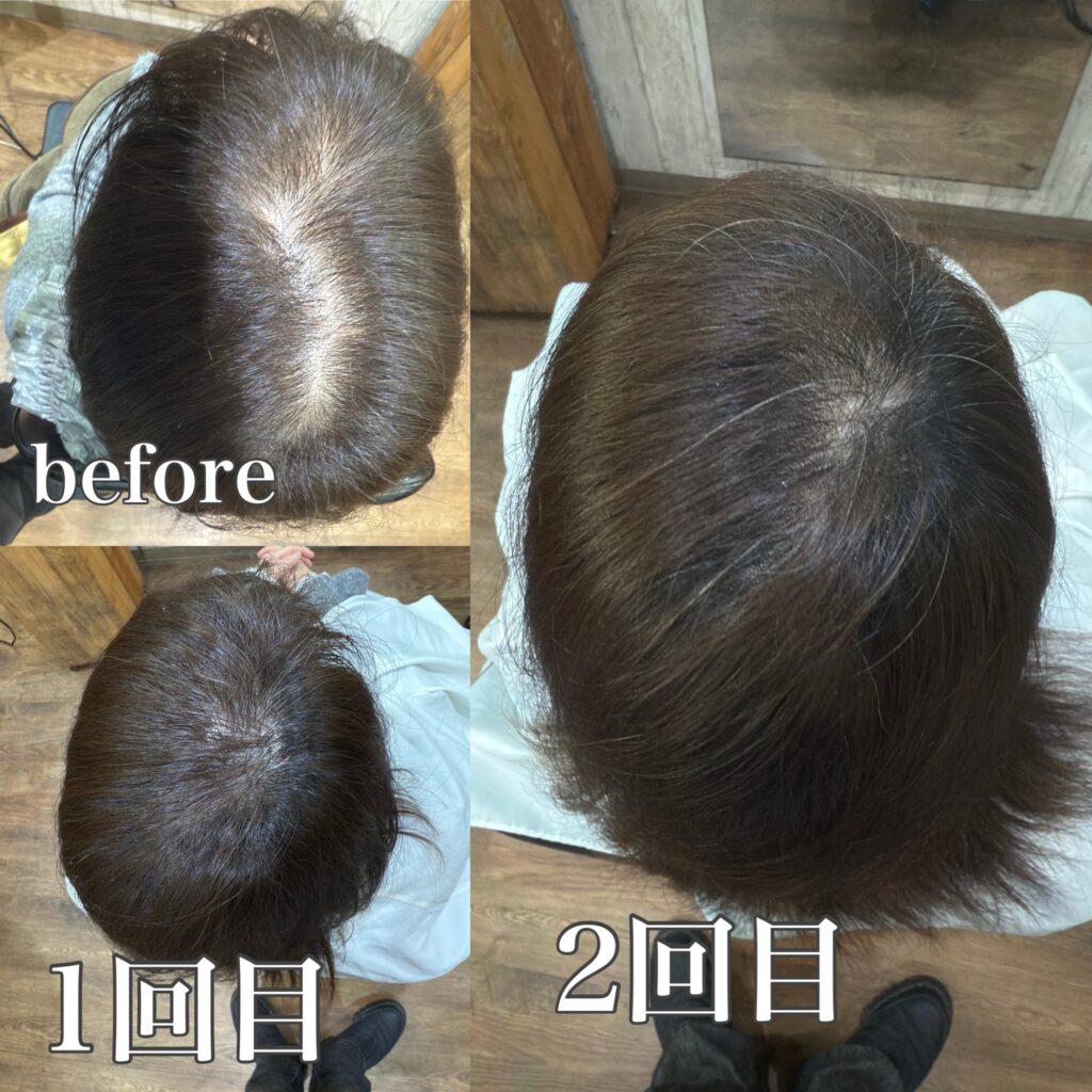 女性の方でも根本のパックリ分け目にボリュームが出たり、立ち上がりも復活します。