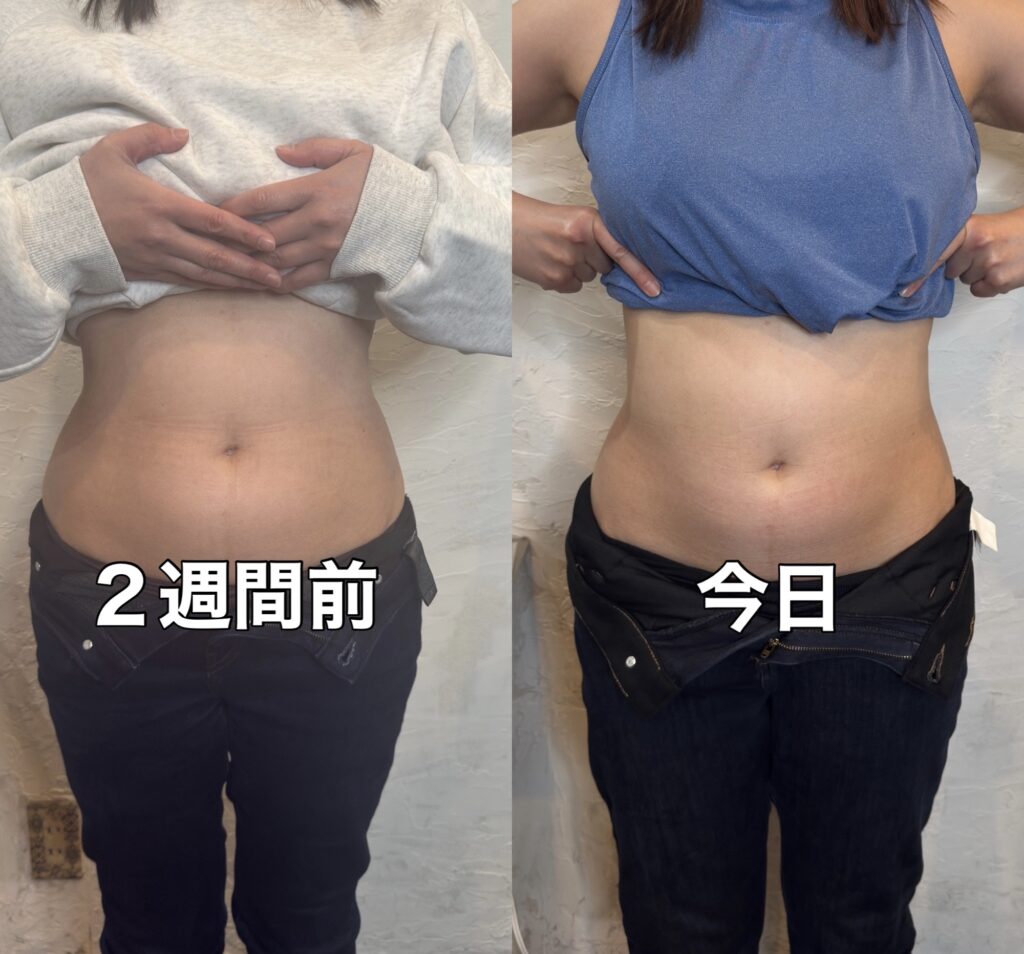 下腹部の丸みが減っている おへそ下〜骨盤ラインにかけての横の張り出しがスッと内側へ 皮膚表面が少しフラットになり、柔らかくなった後の整理感が出ています