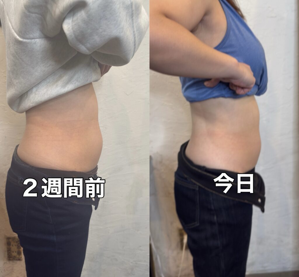 いちばん分かりやすいポイントです 下腹が前に突き出していたラインが、明らかに後退 腰〜お腹のカーブがなだらかになっている