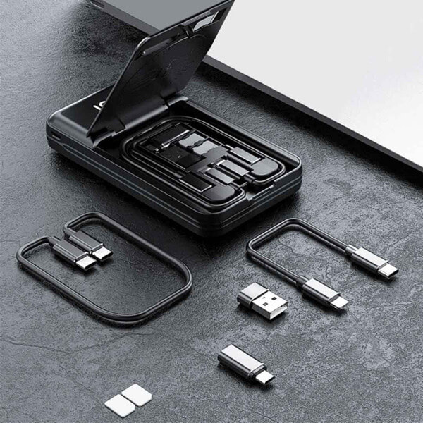 本体に収納されている2本の付属ケーブル(USB Type-C to C 29cm)&(USB Type-C to Lightning 16cm)と変換アダプター(USB Type-A、micro USB)で6種類の接続端子に対応し、それだけでなく