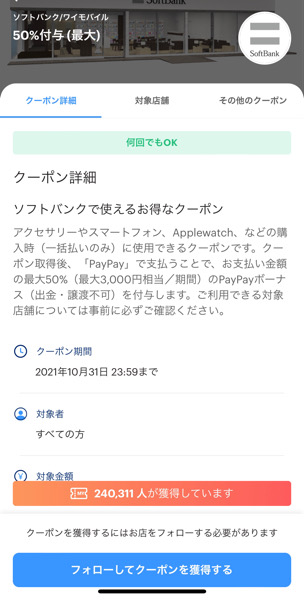 かなり安くなるのでPayPayをお使いの方はクーポンからソフトバンクショップに行きお試しあれ。