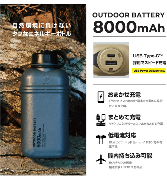 アウトドア環境での水や砂に強い、JIS保護等級IP67相当の防水・防塵タイプのモバイルバッテリーです。
