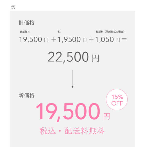 今までは商品価格+消費税+送料だったのが一括表記になり、それに伴い税込、送料が無料の形になり実質の値下げとなっております。