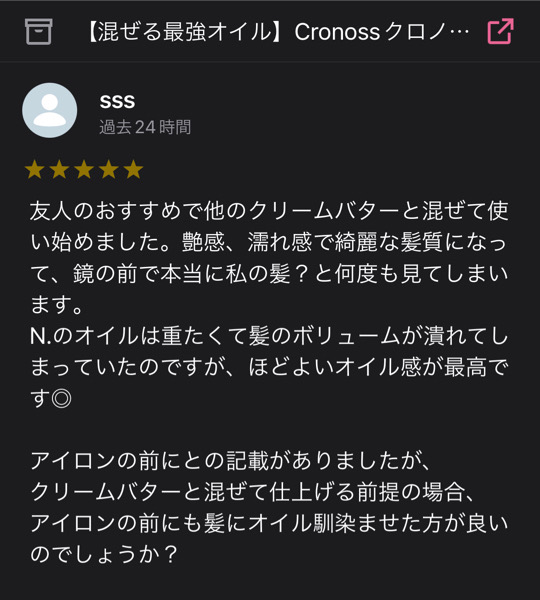 先日オンライシショップからクロノスオイル¥5500をご購入してもらった方からレビューを頂きました。