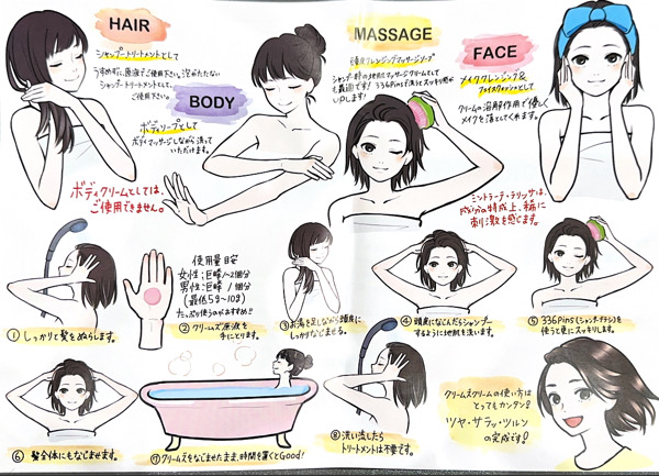 そんなクリームズクリームですがクリームタイプのシャンプーなのですがよく使い方がわからないという方が多いのですがこんなパンフレットが出来てました。