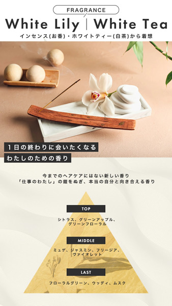 こちら香りですがWhite Lily/White Teaの香りになります。 コンセプトはお香・ホワイトティーから着想した1日の終わりに会いたくなる わたしのための香りとのことです。