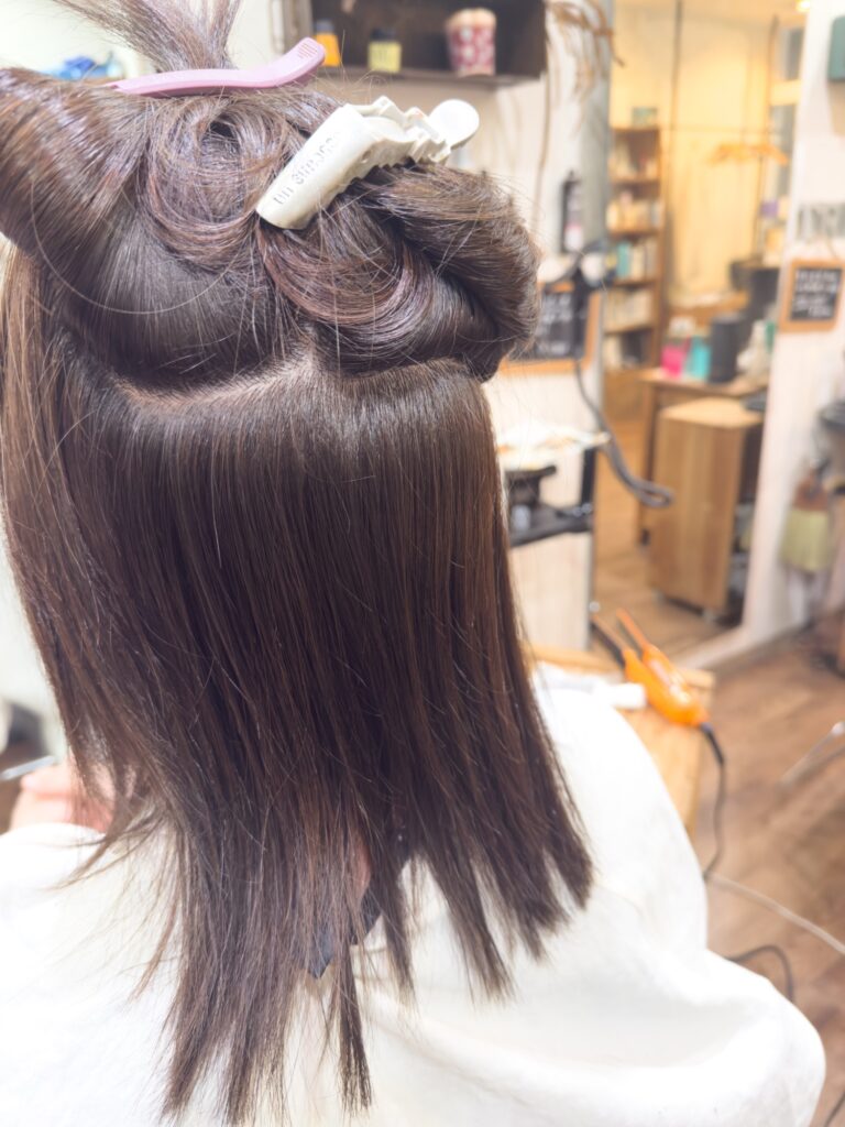 ※今回はカットなしで、カラー+トリートメント+正しいオイルの入れ方だけでここまで変化してます。もちろんカラーの色合い、トリートメントの効果もあります。