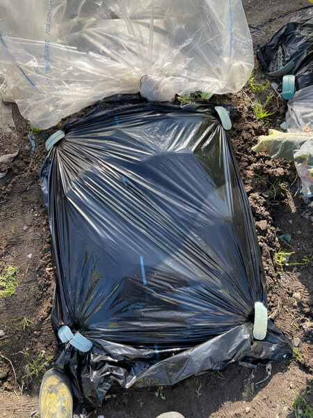 ゴミ袋を被せて次の種入れるまで畑を寝かしつけておきます。