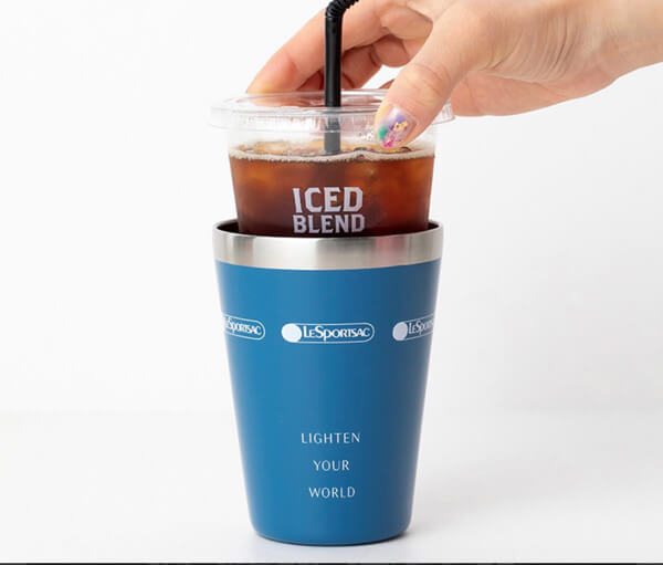 LESPORTSAC(レスポートサック)」のブランドブックにコンビニのコーヒー用のタンブラーがついています。