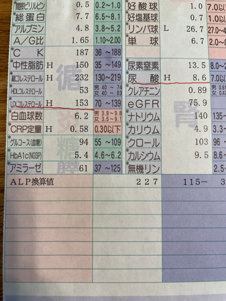 コレストロールと尿酸が高かったようです。