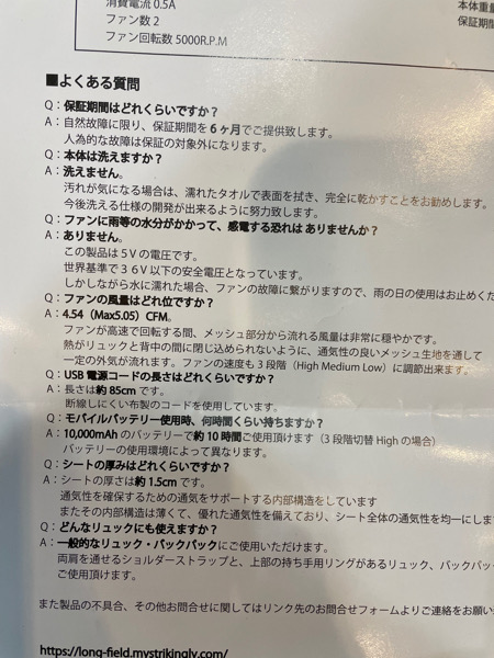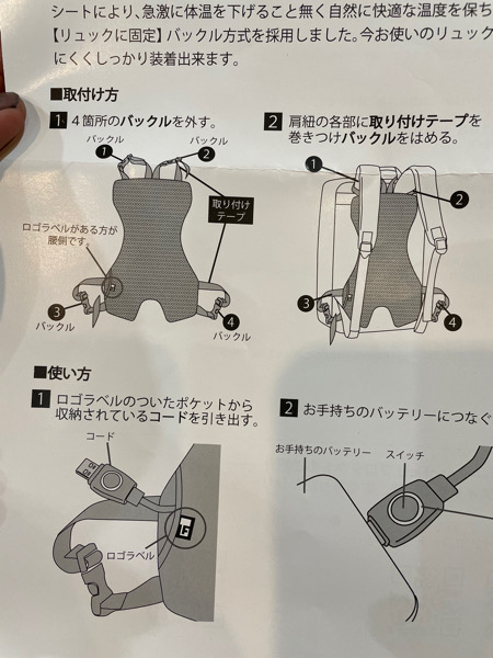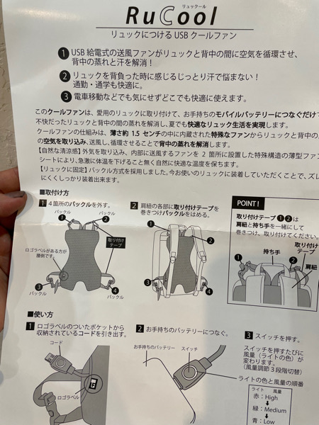 そしていわゆる扇風機のような風ではなくてリュックと背中の間が蒸れないように空気を循環させると言うイメージなので着けて涼しいというのではなくて長時間つけて暑くない。