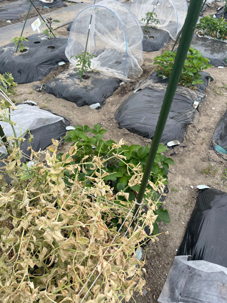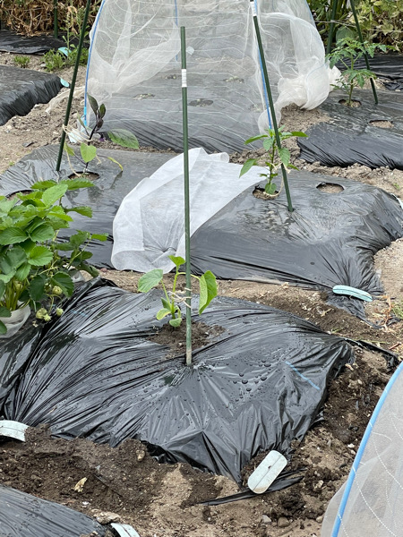 ここまでできたら上からシート被して苗を植えて支柱を立てて完成。