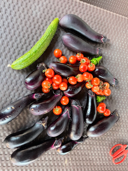 久々に行くと茄子はかなりできていて、きゅうりは暑さのせいか枯れかけてました……