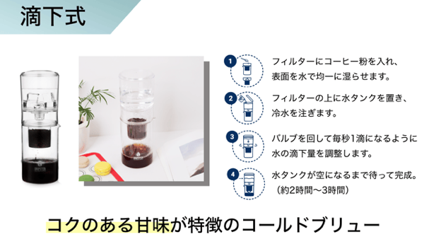 コーヒー粉を水に漬けることで、じんわりとコーヒーの旨味が抽出されるため、滴下式と比べるとスッキリした味わいが楽しめ