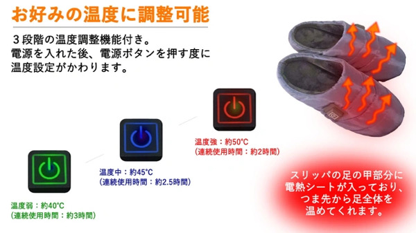 ヒーターが内臓されているスリッパらしく履くと暖房なしで暖かくなります。